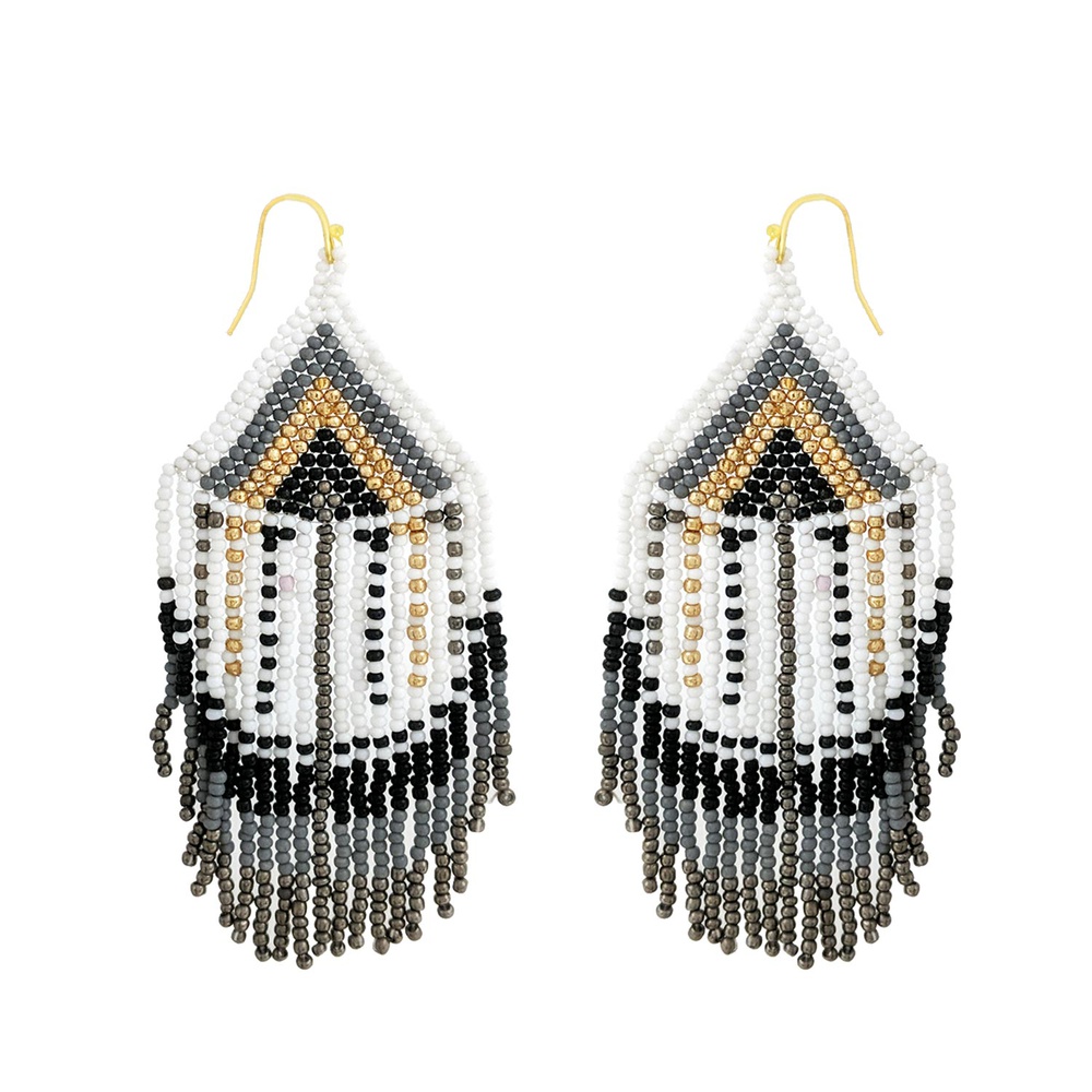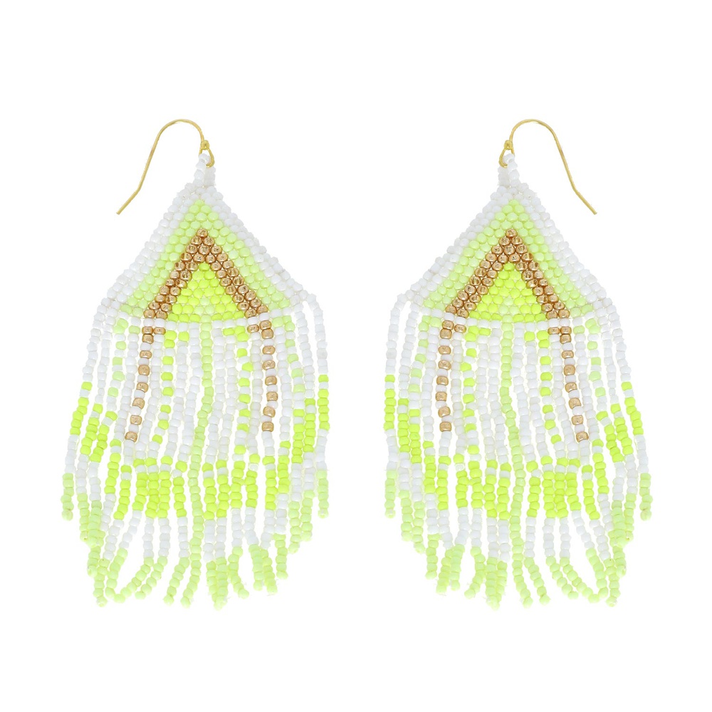 NATIVE AMERICAN TRIANGLE DESIGN BEADED TRIANGLE LONG DROP TASSEL HOOK EARRINGS