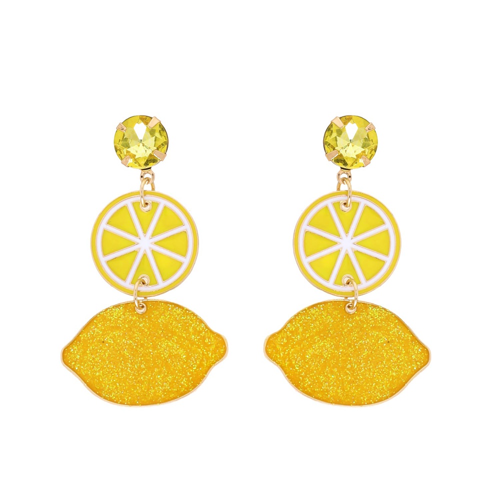 3-TIER CRYSTAL RHINESTONE GLITTER ENAMEL COATED YELLOW LEMON EARRINGS IN GOLD TONE METAL