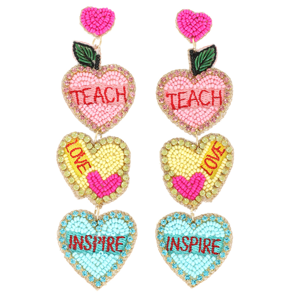 4-TIER HEART SHAPED APPLE"TEACH, LOVE INSPIRE" TEACHER APPRECIATION CRYSTAL RHINESTONE BEADED EMBROIDERY LONG DROP EARRINGS