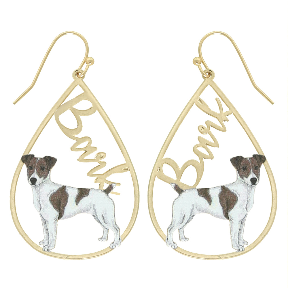 "BARK" OPEN TEARDROP JACK RUSSELL DOG DANGLE AND DROP FISH HOOK EARRINGS IN GOLD TONE METAL