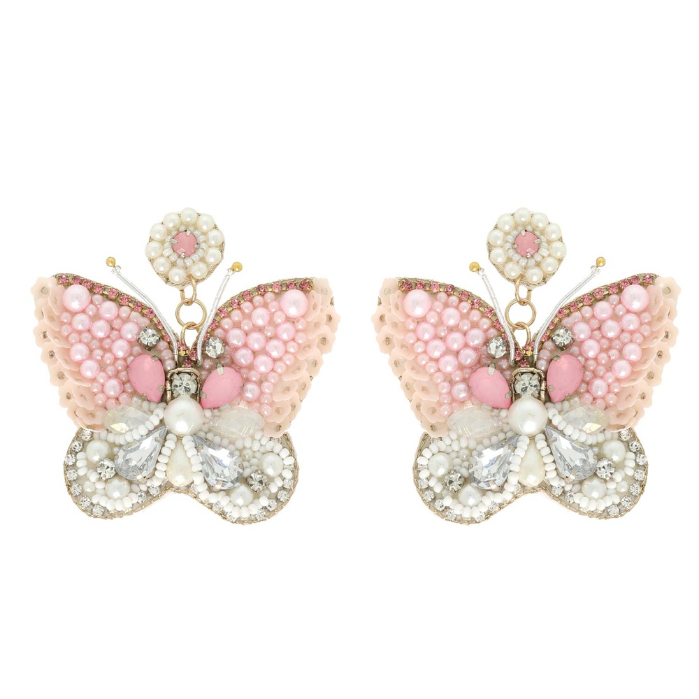 2-TIER WHIMSICAL CRYSTAL GEMSTONE BEADED EMBROIDERY BUTTERFLY EMBELLISHED DROP EARRINGS