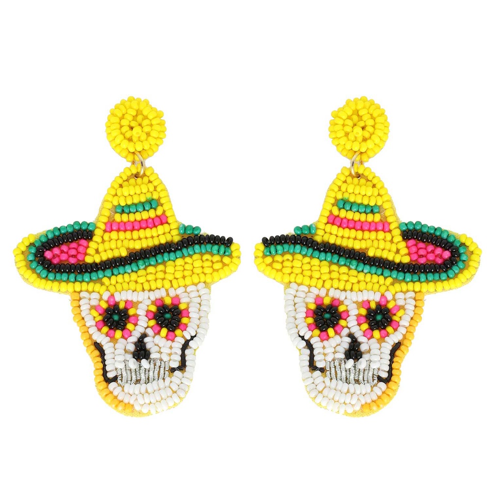 2-TIER CINCO DE MAYO SOMBRERO SUGAR SKULL BEADED EMBROIDERY LONG DROP EARRINGS