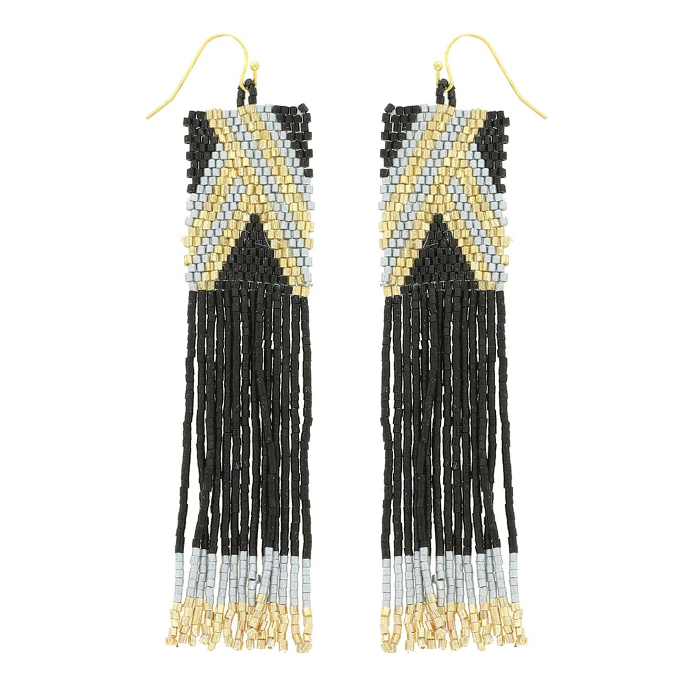 NATIVE AMERICAN GEOMETRIC PRINT RECTANGULAR DESIGN BEADED TASSEL LONG DROP FISH HOOK EARRINGS