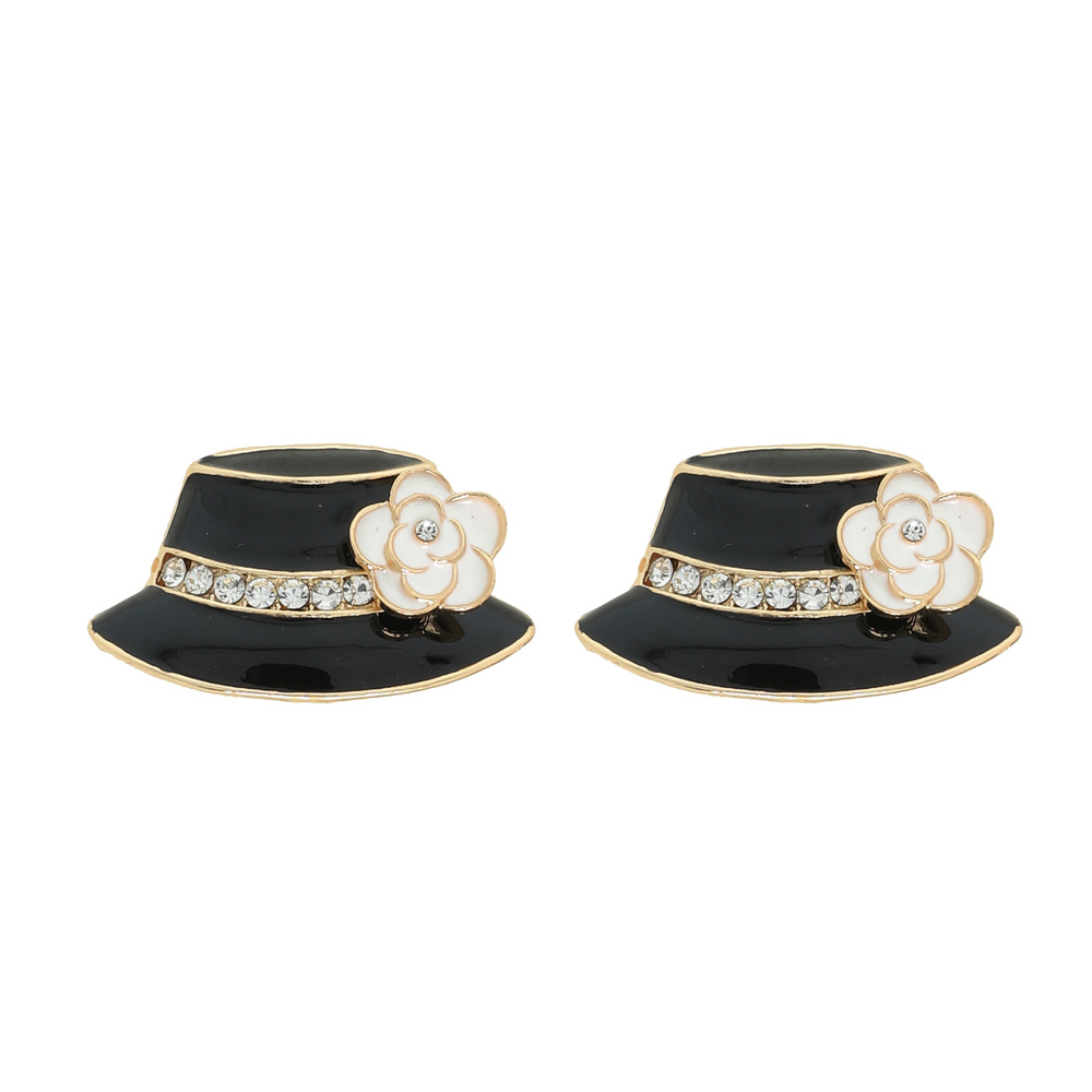 FASHIONISTA CAMELLIA FLORAL FASHION BANDED SUN HAT ENAMEL COATED CRYSTAL RHINESTONE DROP EARRINGS