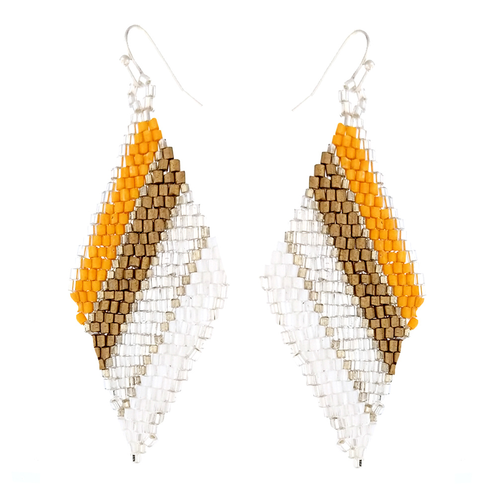 DIAMOND-SHAPED DIAGONAL STRIPE SEED BEADED EMBROIDERY DROP EARRINGS IN SILVER-TONE METAL