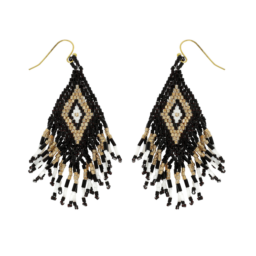 WESTERN NATIVE AMERICAN RHOMBUS SEED BEAD FRINGE EARRINGS
