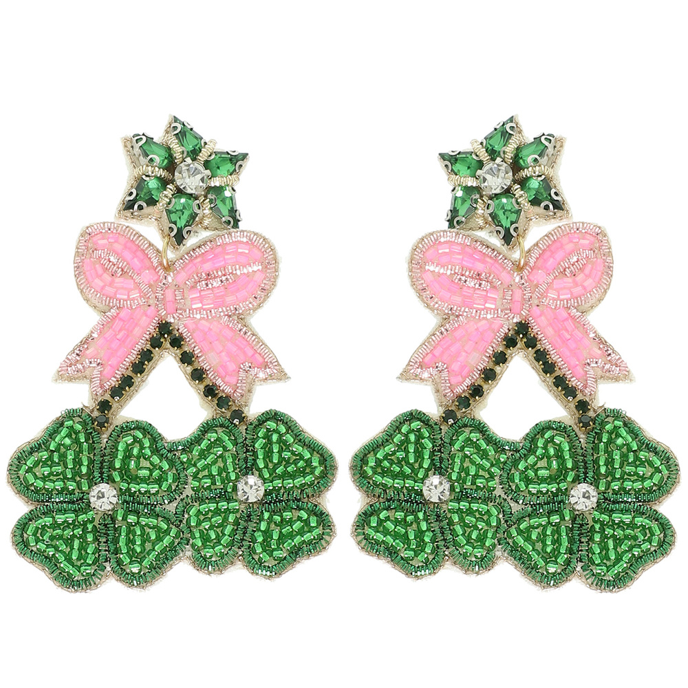 FOUR-LEAF CLOVER CRYSTAL BEAD EMBELLISHED EARRINGS WITH PINK BOW AND STAR