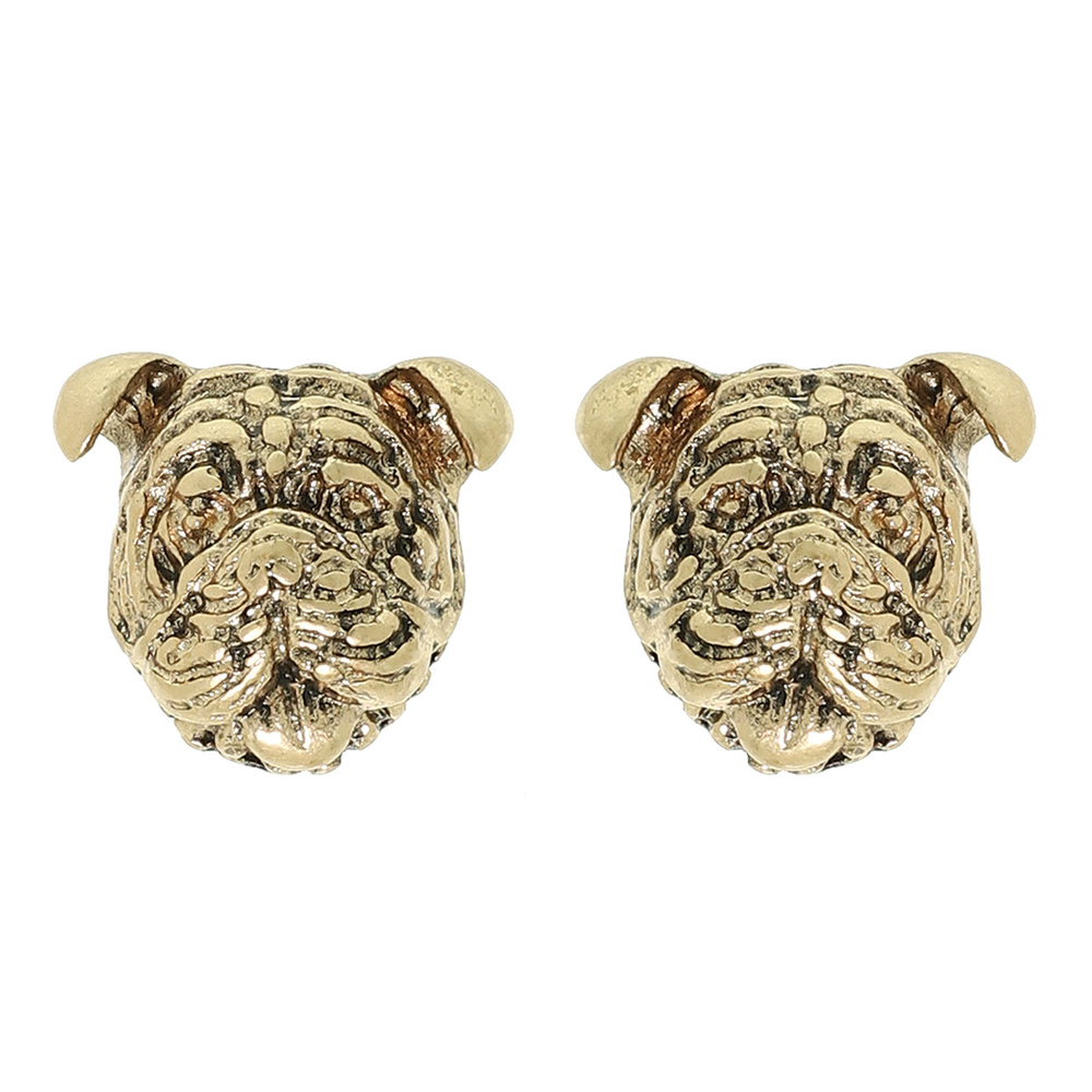 ENGLISH BULLDOG PUPPY FACE STUD EARRINGS IN YELLOW GOLD-TONE METAL