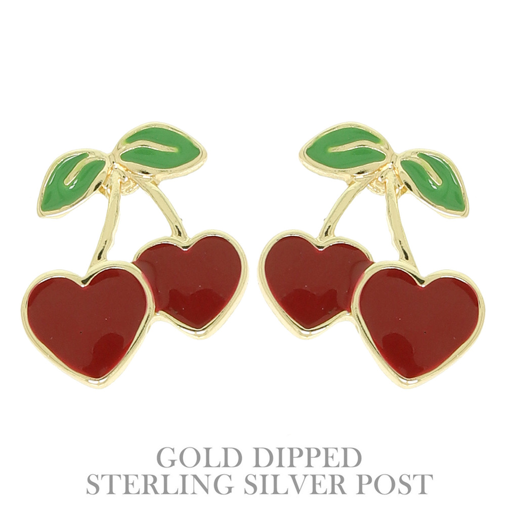 YELLOW GOLD PLATED RED ENAMEL CHERRY HEARTS POST EARRINGS FEATURES STERLING SILVER POST