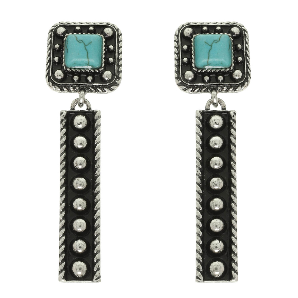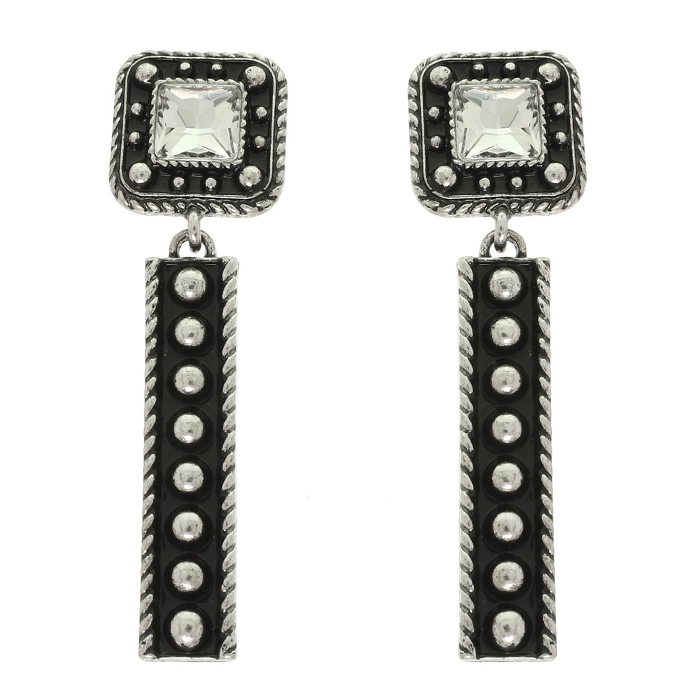 WESTERN SQUARE CONCHO LINEAR EARRINGS WITH CRYSTAL ACCENT IN OXIDIZED SILVER TONE METAL