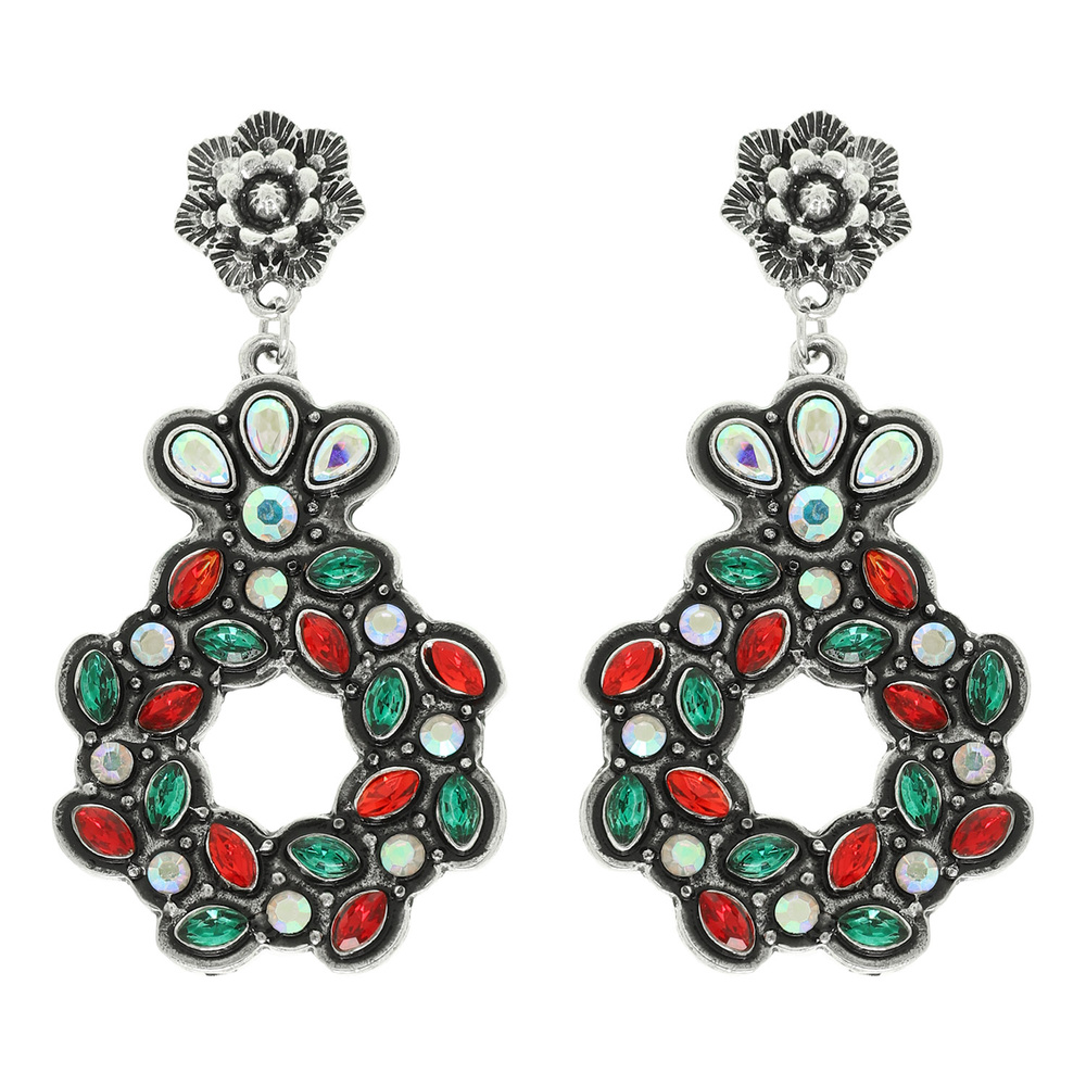 WESTERN CHRISTMAS WREATH POST DANGLE EARRINGS WITH RED GREEN IRIDESCENT CRYSTALS
