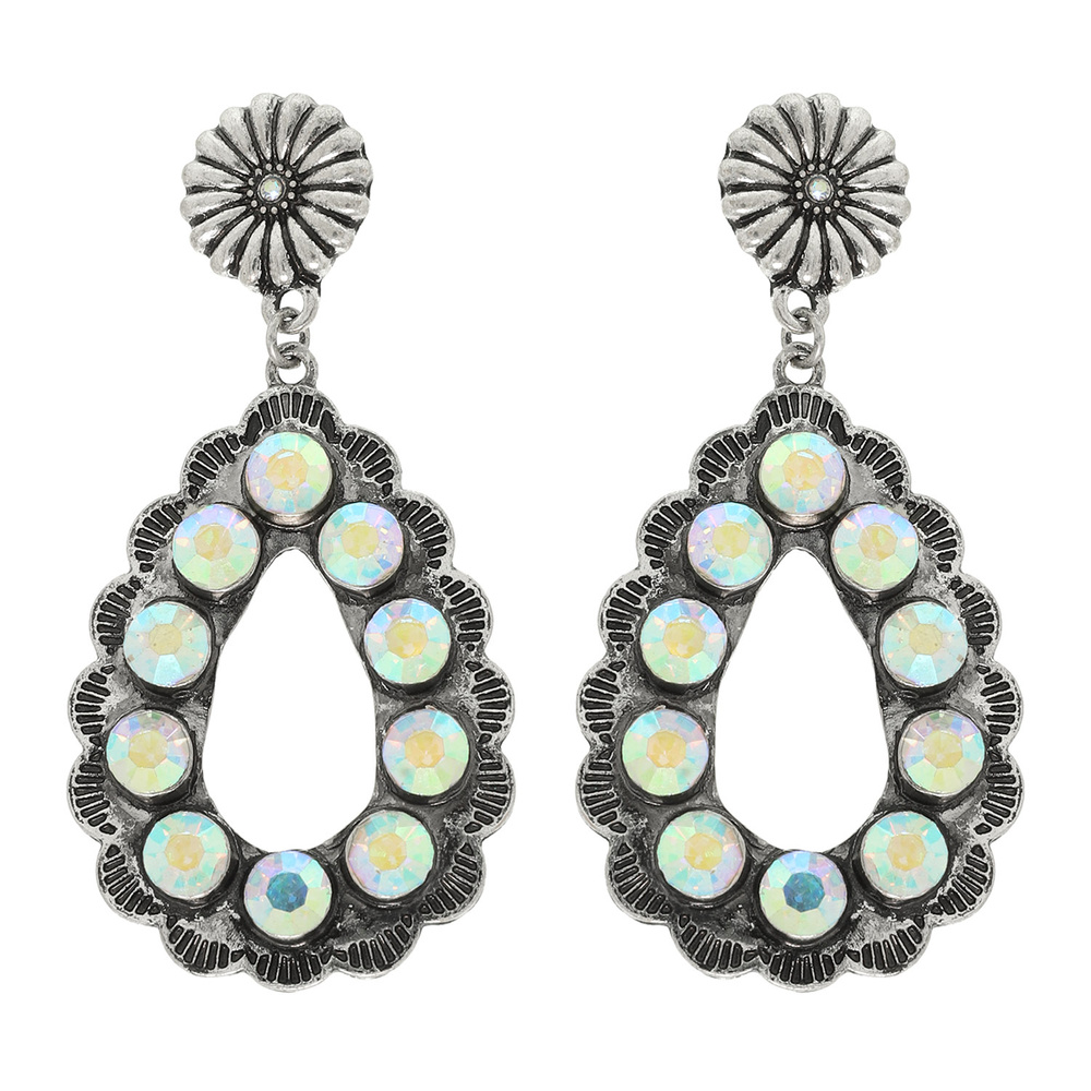 WESTERN CRYSTAL TEARDROP HOOP POST EARRINGS WITH SQUASH BLOSSOM ACCENT