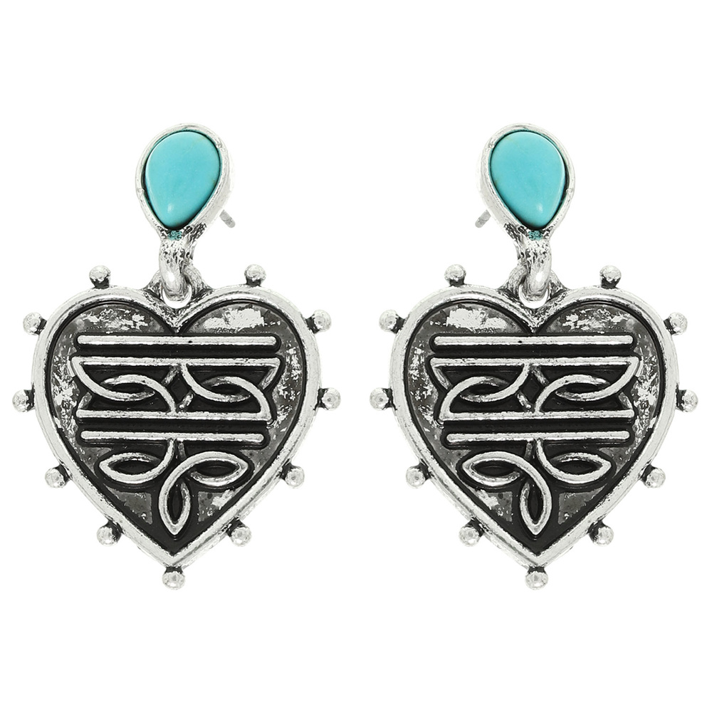 WESTERN BOOT STITCH HEART DROP EARRINGS WITH TURQUOISE ACCENT
