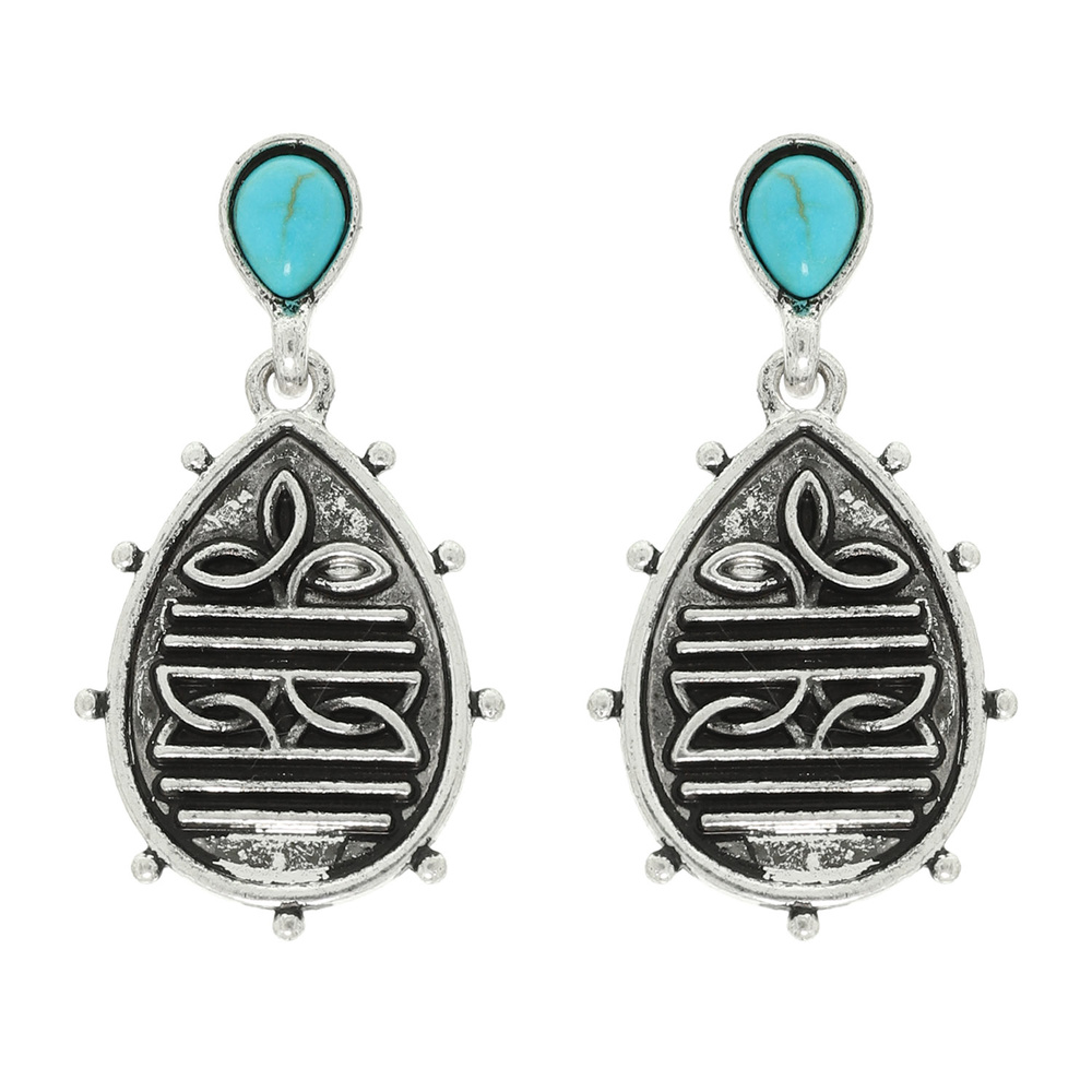 WESTERN BOOT STITCH OVAL DROP EARRINGS WITH TURQUOISE ACCENT