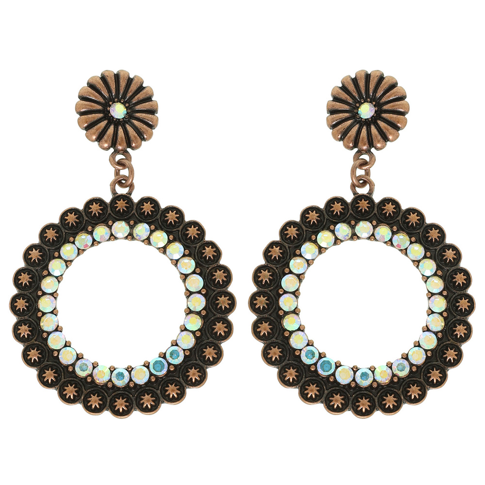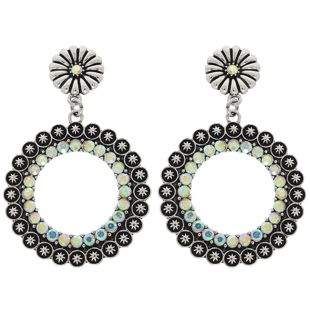 WESTERN FLORAL ROUND CONCHO POST DANGLE EARRINGS WITH CRYSTAL ACCENTS