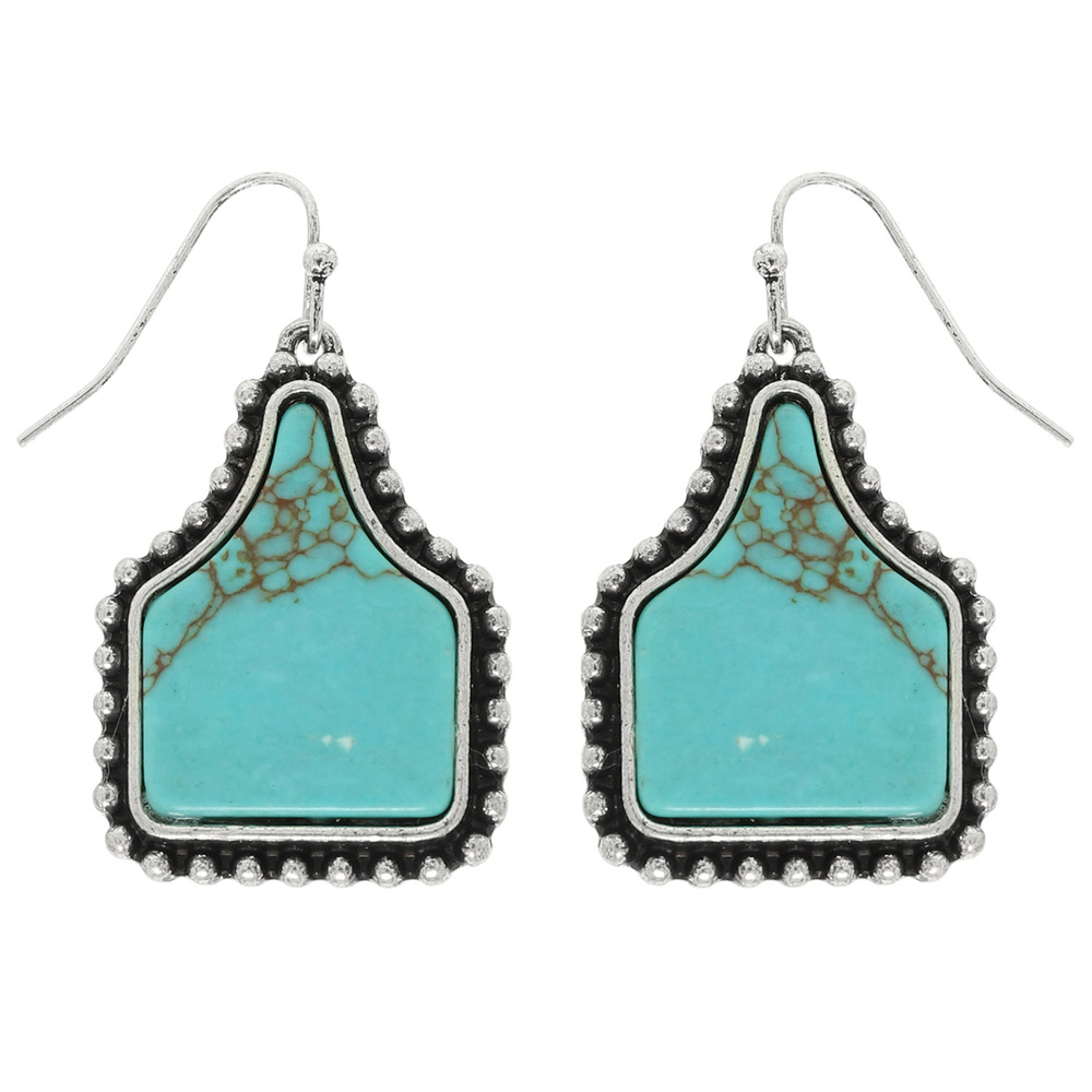 WESTERN TURQUOISE CATTLE TAG DANGLE EARRINGS IN OXIDIZED SILVER TONE METAL