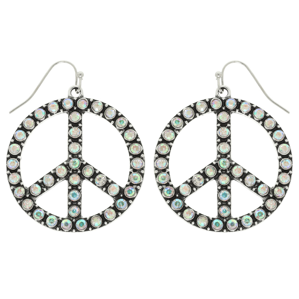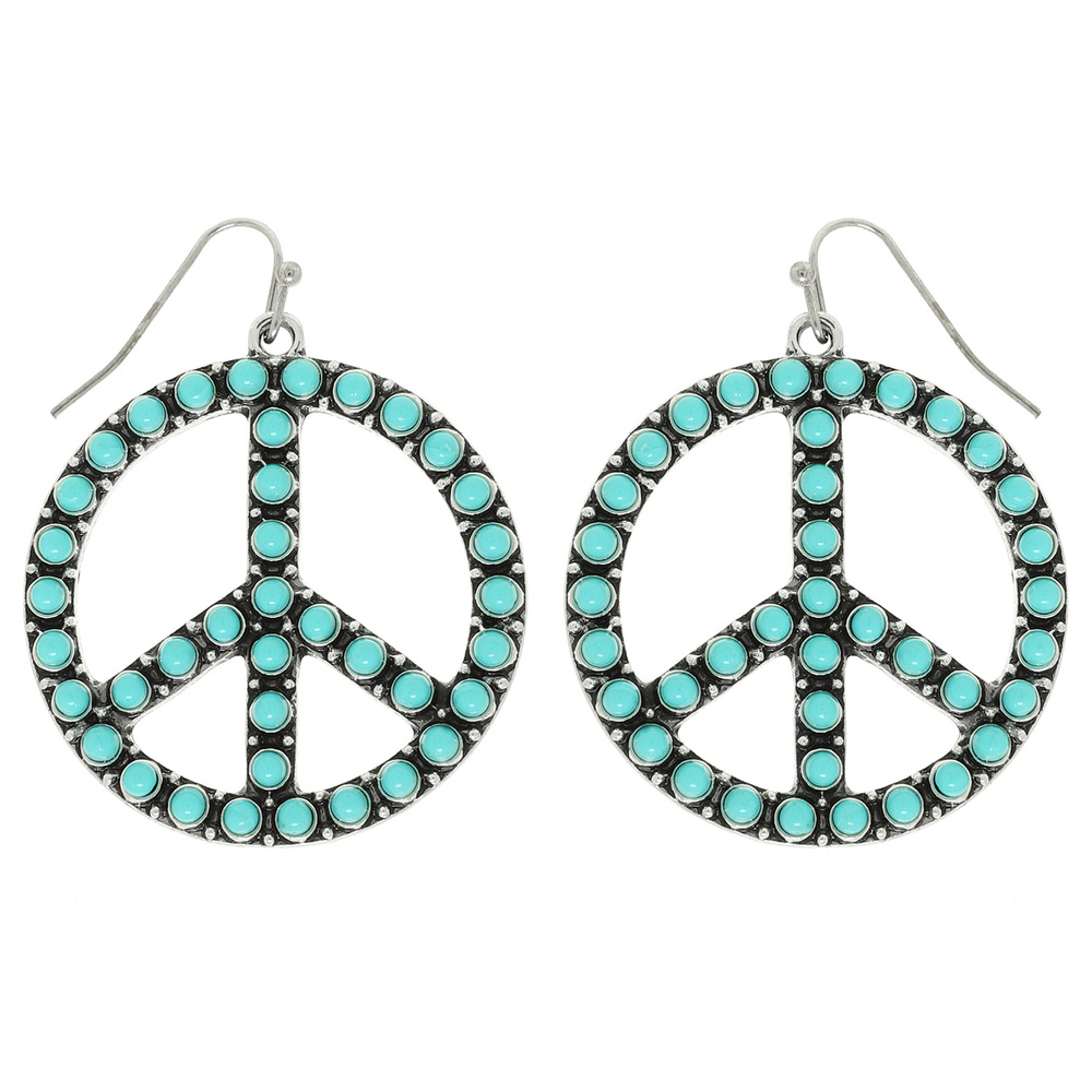 WESTERN CRYSTAL OR TURQUOISE PEACE SIGN DANGLE EARRINGS IN OXIDIZED SILVER TONE METAL