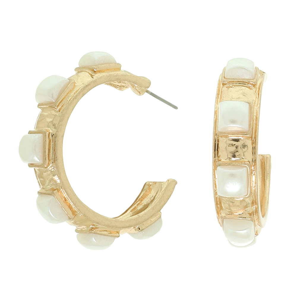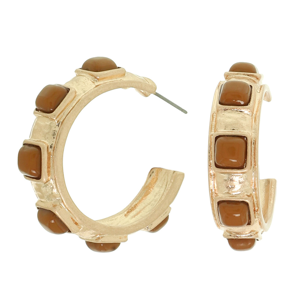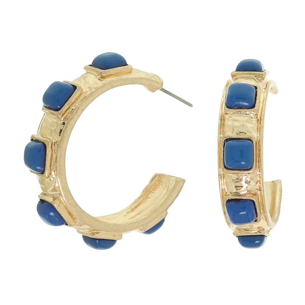 BEZEL SET COLORED SQUARE STONE HOOP EARRINGS IN GOLD TONE METAL