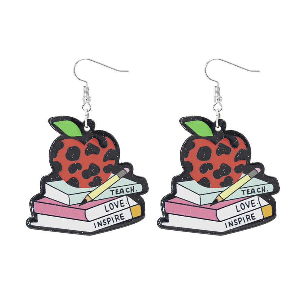 TEACH LOVE INSPIRE BOOK STACK EPOXY DANGLE EARRINGS WITH LEOPARD APPLE PRINT DETAIL