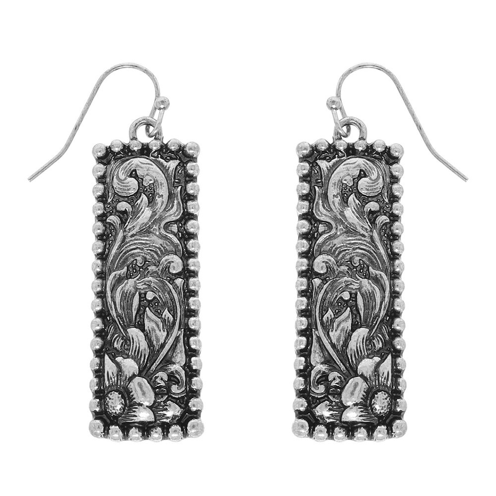 WESTERN FLORAL FILIGREE RECTANGLE DANGLE EARRINGS IN OXIDIZED SILVER TONE METAL