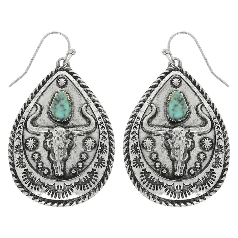 WESTERN LONGHORN TEARDROP DANGLE EARRINGS WITH TURQUOISE ACCENTS