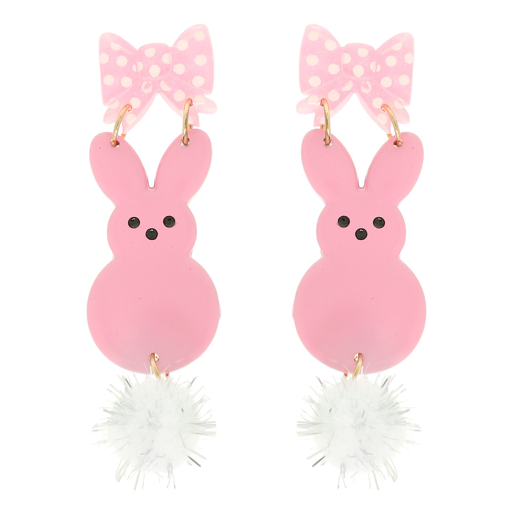 PINK BUNNY POST DANGLE EARRINGS WITH POLKA DOT BOW AND POM