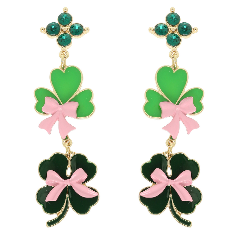 GREEN SHAMROCK LINEAR EARRINGS WITH PINK BOW AND CRYSTAL ACCENTS