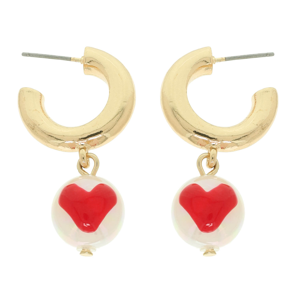 GOLD TONE HUGGIE HOOP EARRINGS WITH RED HEART GLASS BEAD