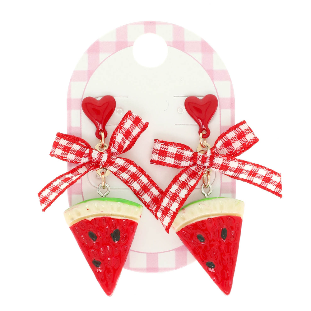 WATERMELON DROP EARRINGS WITH RED WHITE PATTERN GINGHAM BOW AND HEART ACCENT