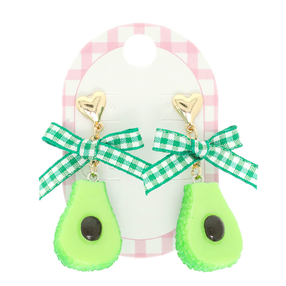 AVOCADO DROP EARRINGS WITH GREEN WHITE PATTERN GINGHAM BOW AND HEART ACCENT