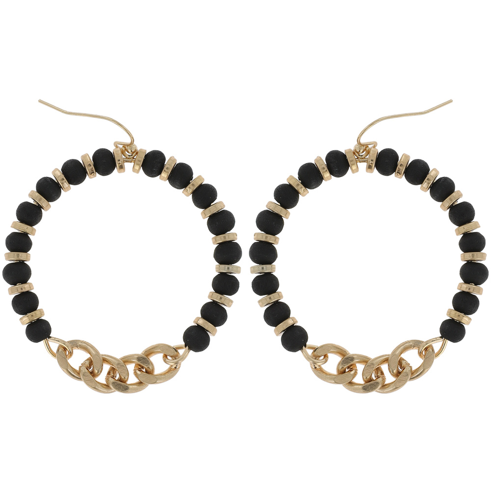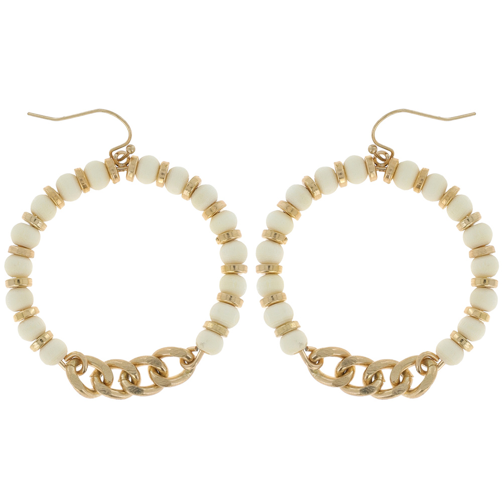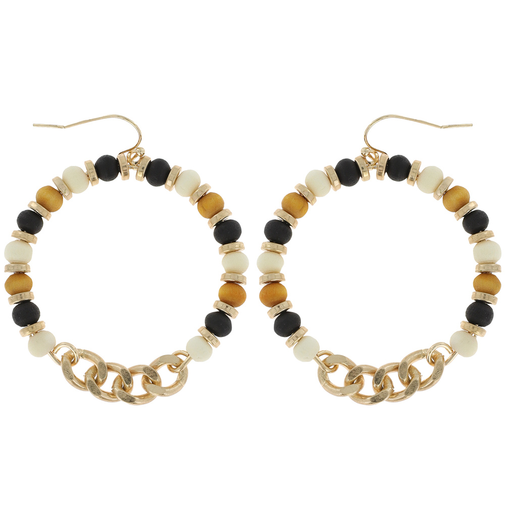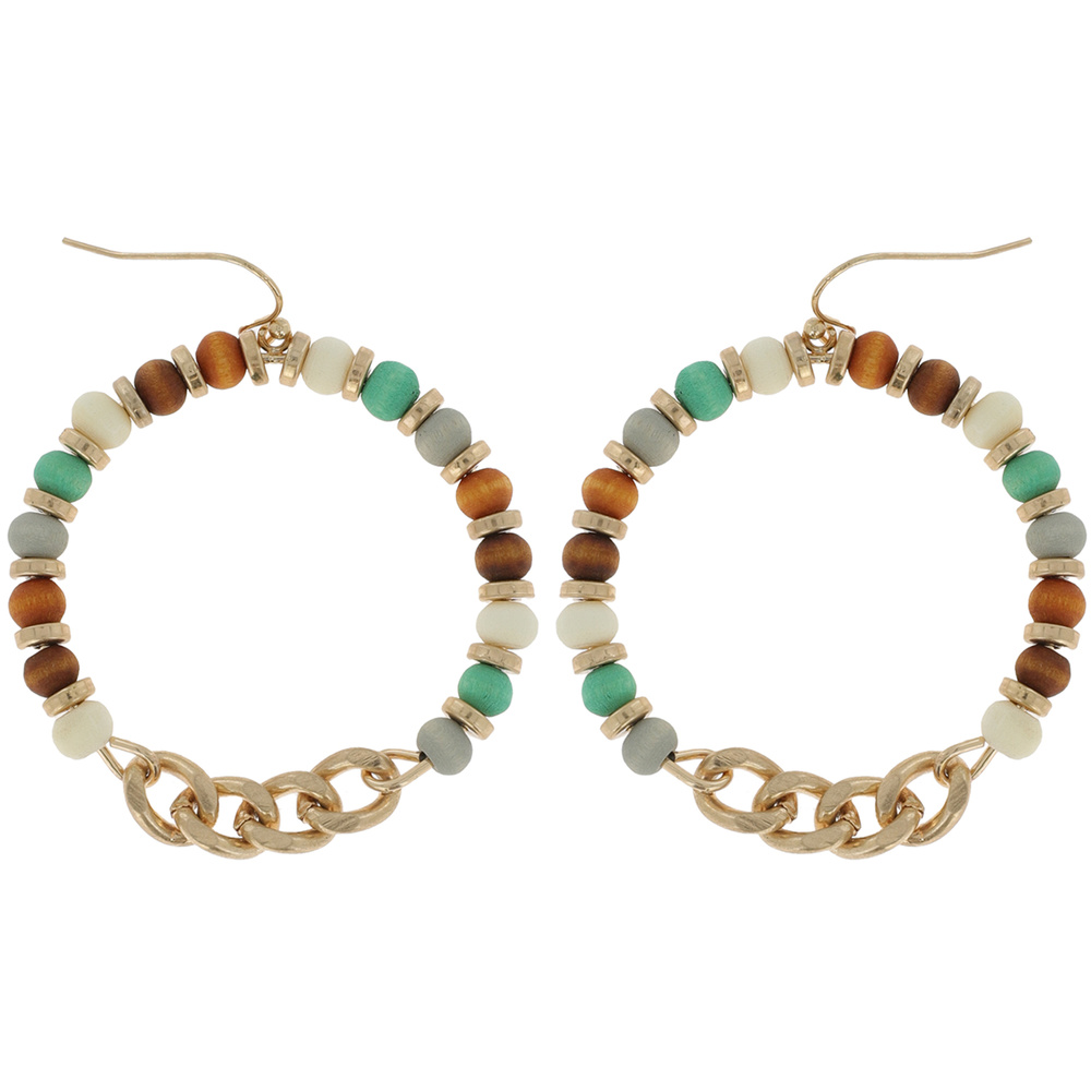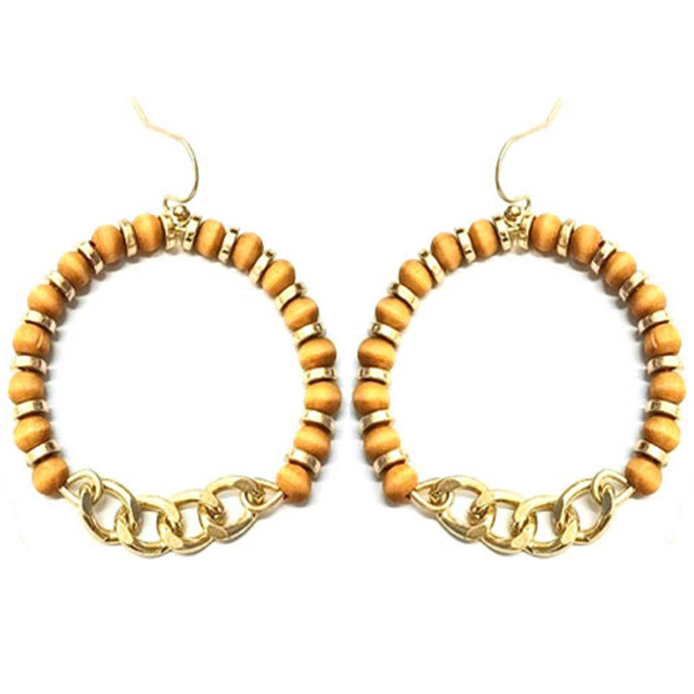 BOHO WOODEN BEADED OPEN CIRCLE CHAIN FISH HOOK DANGLE EARRINGS IN GOLD TONE METAL