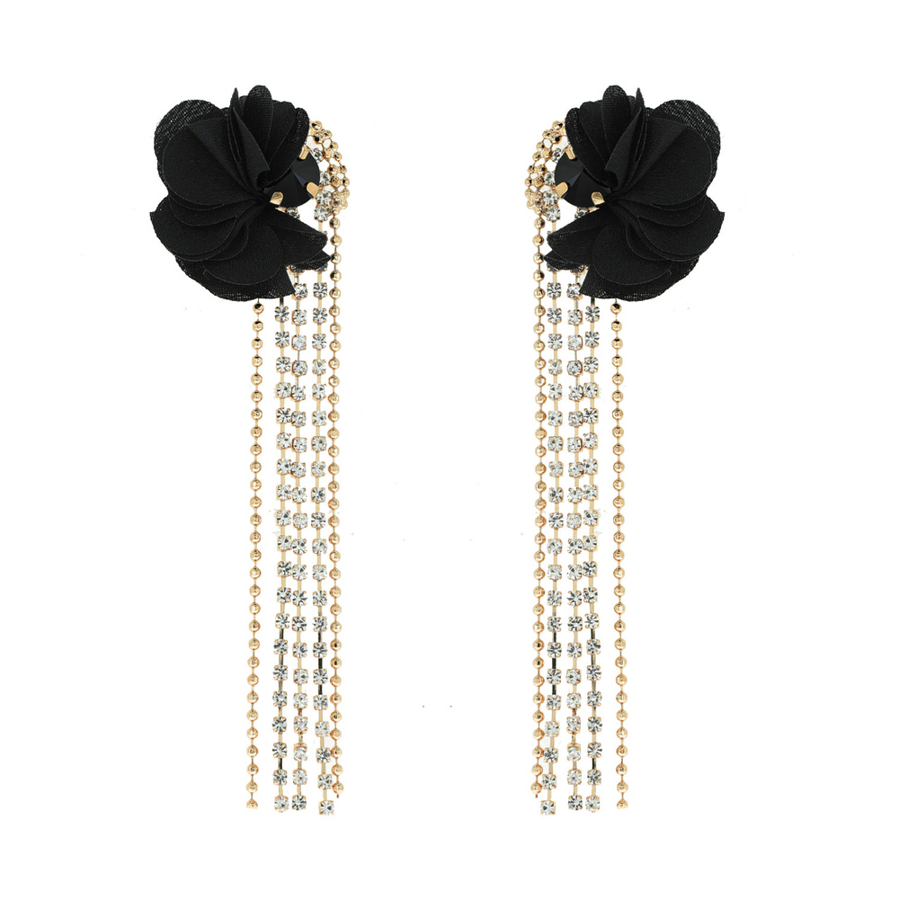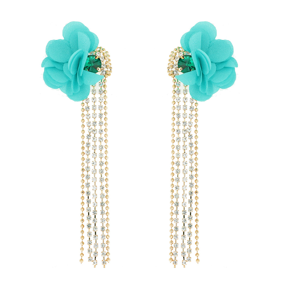 Boho Fabric Flower Petal Crystal Tassel Long Drop Earrings