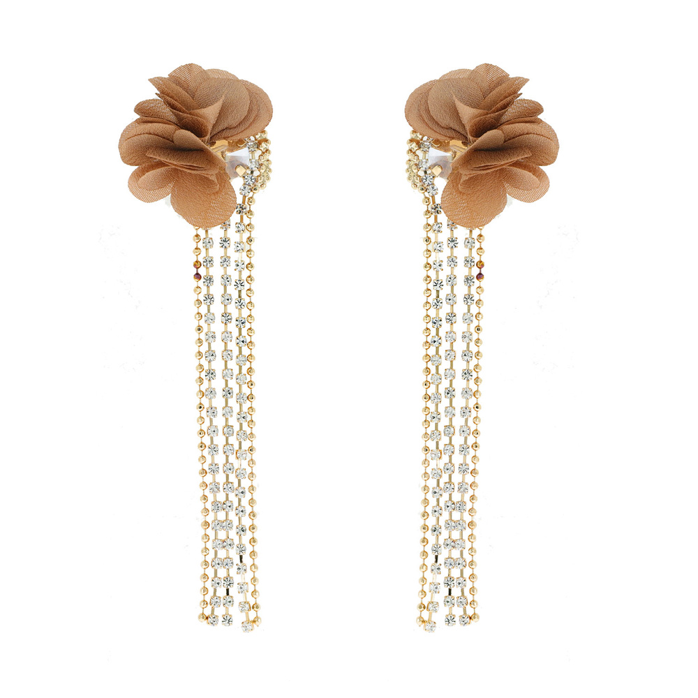 BOHO FABRIC FLOWER PETAL CRYSTAL TASSEL LONG DROP EARRINGS