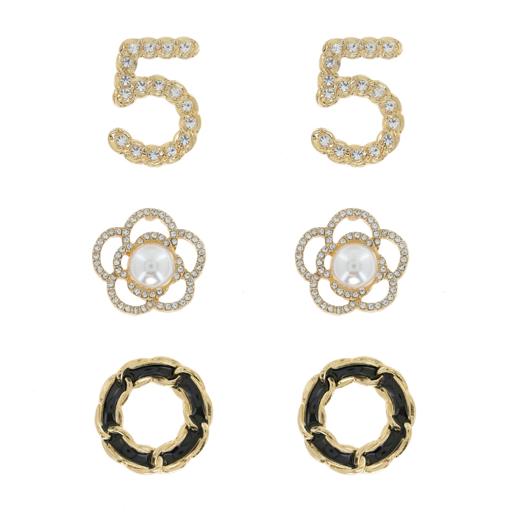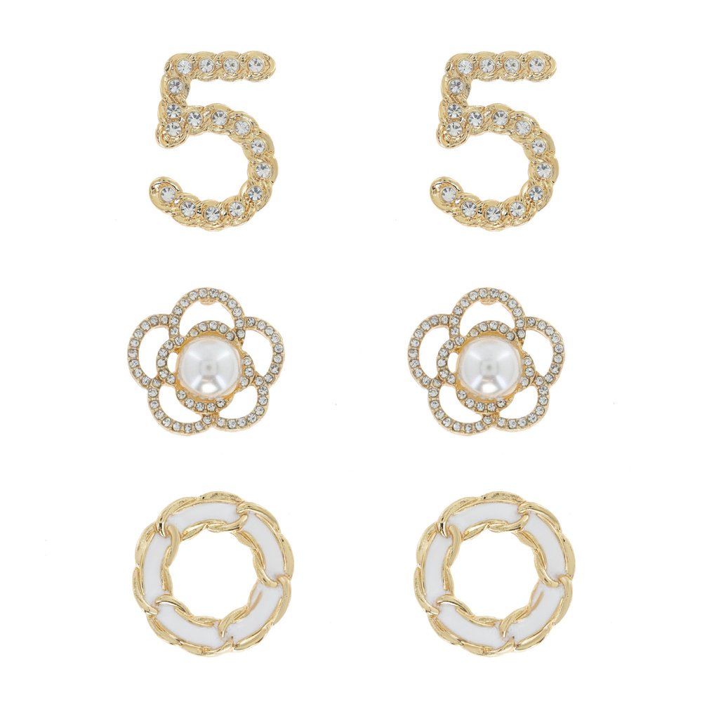 Number Five / Flower/ Chain Link Circle - Fashionista 3 Pair Pearl Studded Crystal Pave Enamel Stud Earring Set