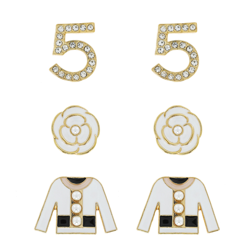 Number Five / Rose /cardigan Sweater - Fashionista 3 Pair Pearl Studded Crystal Pave Enamel Stud Earring Set