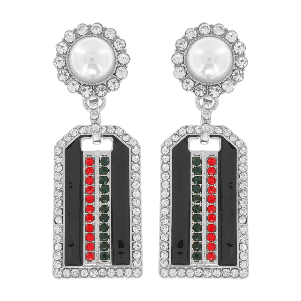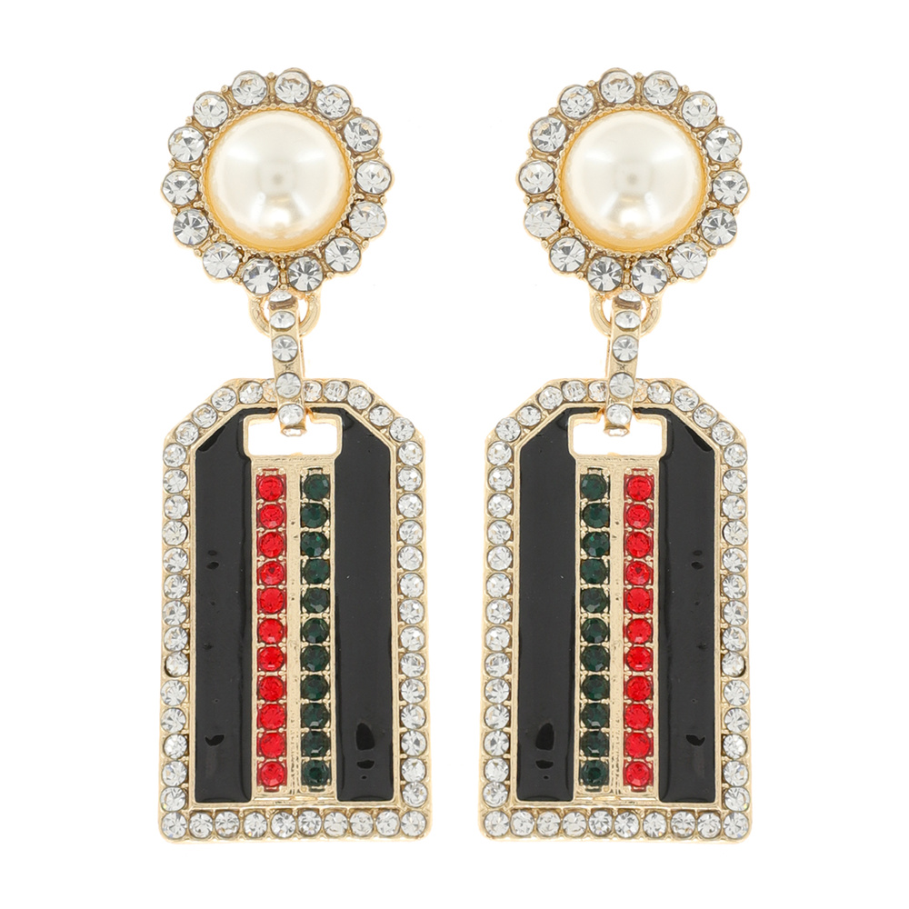 STRIPES-CRYSTAL RHINESTONE PEARL POST DANGLE AND DROP ENAMEL COATED DOG TAG EARRINGS