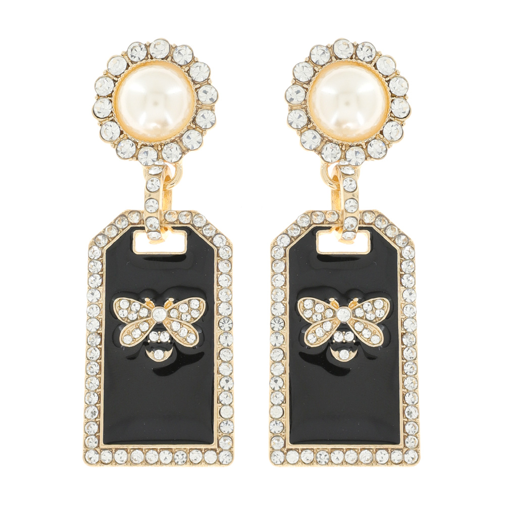 Honey Bee-crystal Rhinestone Pearl Post Dangle And Drop Enamel Coated Dog Tag Earrings