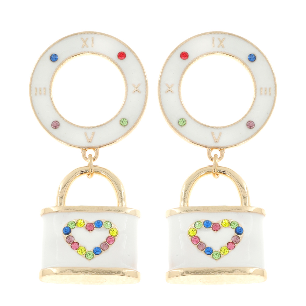 2-tier Roman Numerals Crystal Rhinestone Pave Open Circle Heart Design Padlock Dangle And Drop Enamel Coated Earrings
