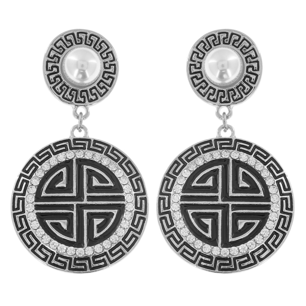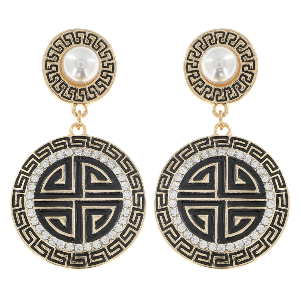 2-TIER GREEK KEY PATTERN CRYSTAL RHINESTONE PEARL POST DANGLE AND DROP ENAMEL COATED ROUND EARRINGS