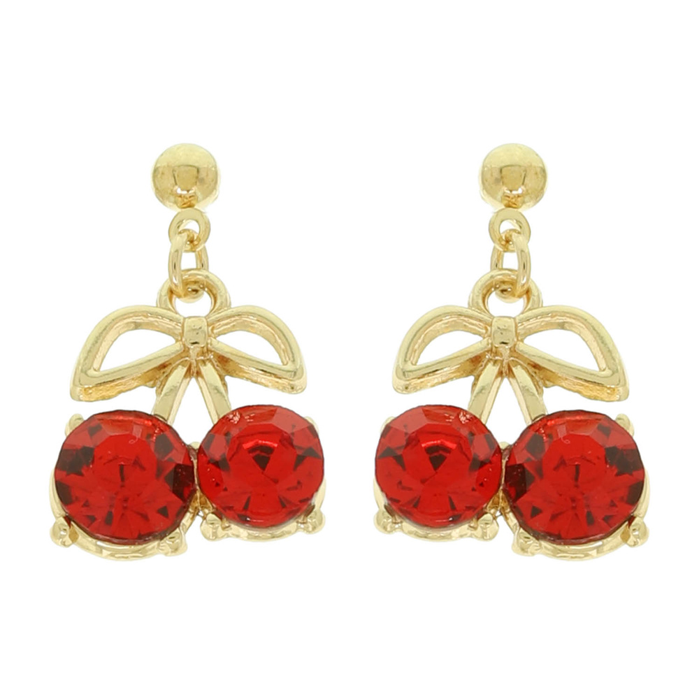 RED CRYSTAL EMBELLISHED BOWKNOTED CHERRY POST DANGLE EARRINGS