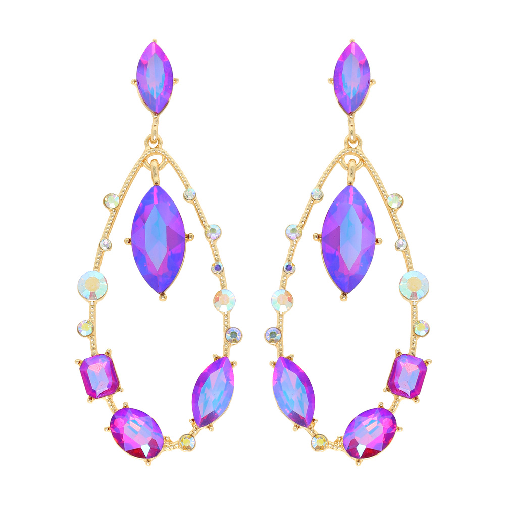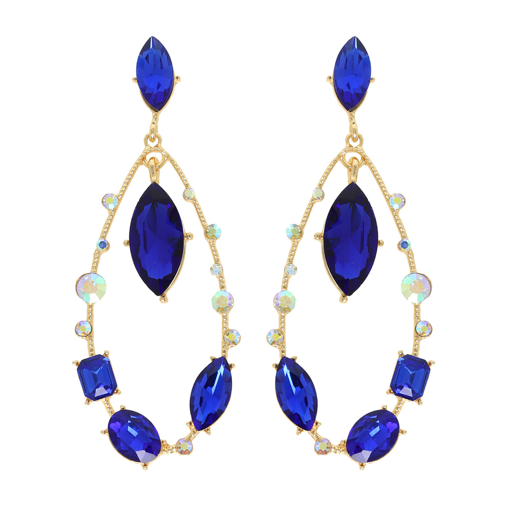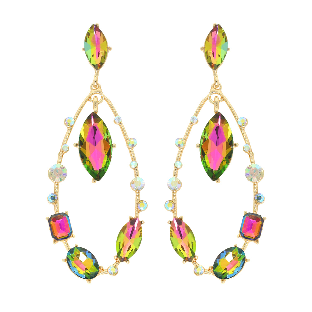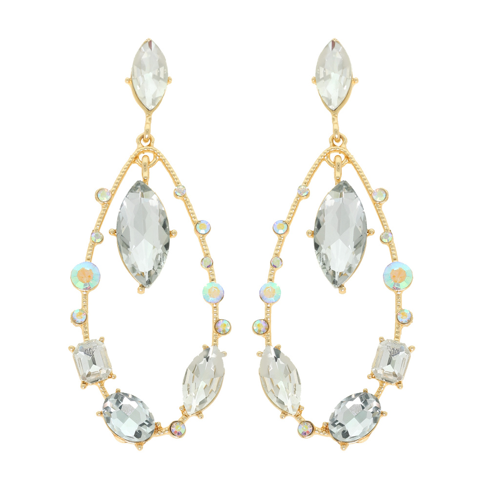 2-TIER GEMSTONE CLUSTER OPEN TEARDROP STATION EARRINGS IN GOLD TONE METAL