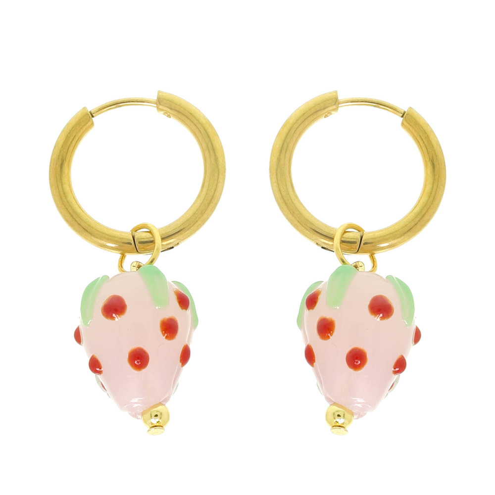 COLORFUL ENAMEL STRAWBERRY CHARM HUGGIE HOOP EARRINGS IN GOLD TONE METAL