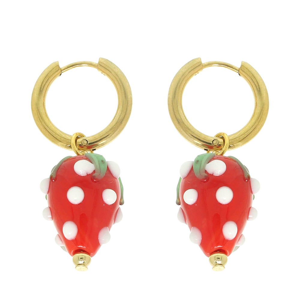 COLORFUL ENAMEL STRAWBERRY CHARM HUGGIE HOOP EARRINGS IN GOLD TONE METAL