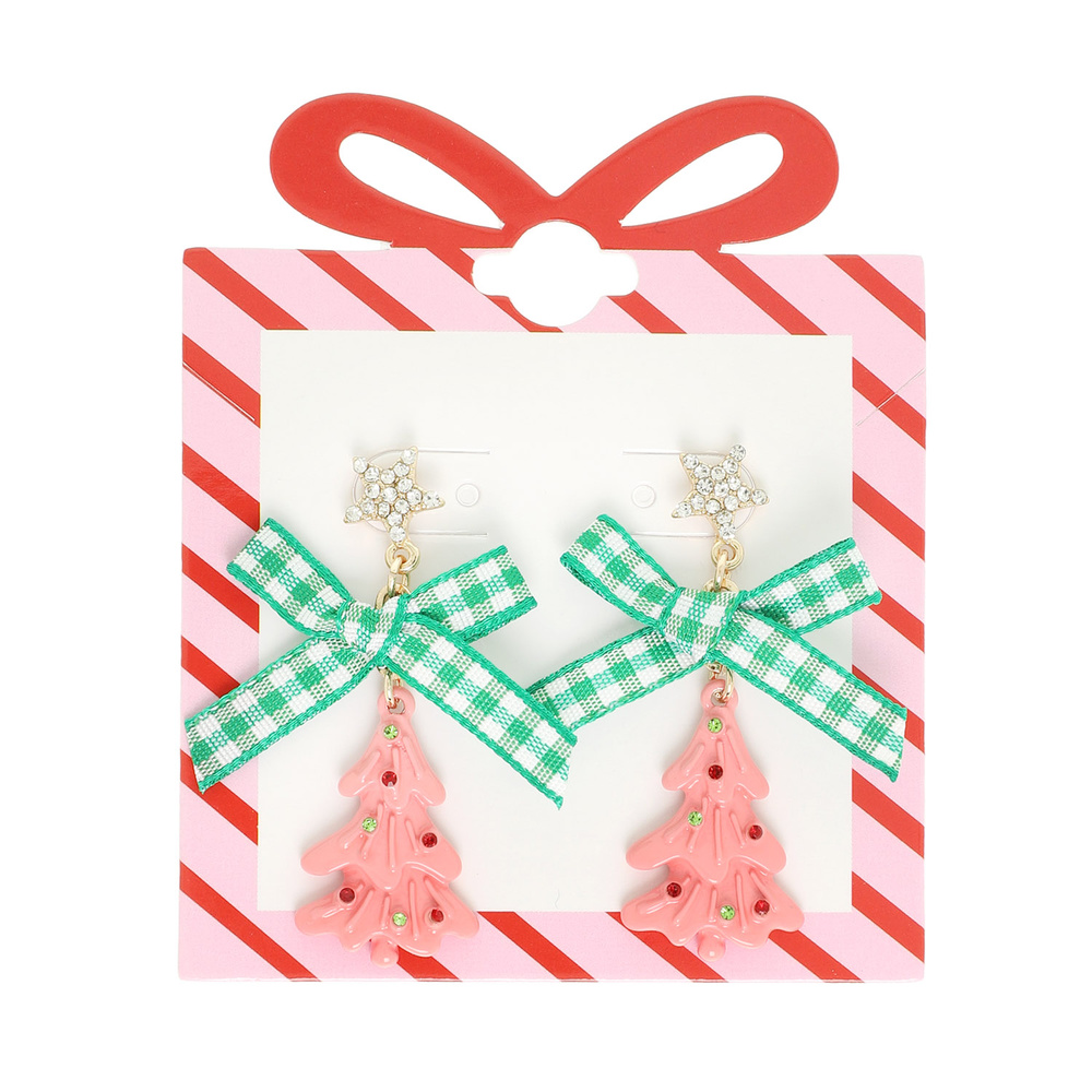HOLIDAY PINK CHRISTMAS TREE DROP EARRINGS WITH GREEN GINGHAM RIBBON BOW AND RHINESTONE STAR