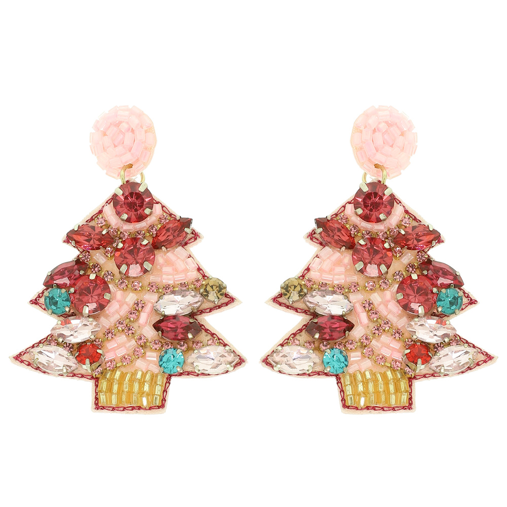 PINK CRYSTAL SEED BEADED CHRISTMAS TREE POST DANGLE EARRINGS
