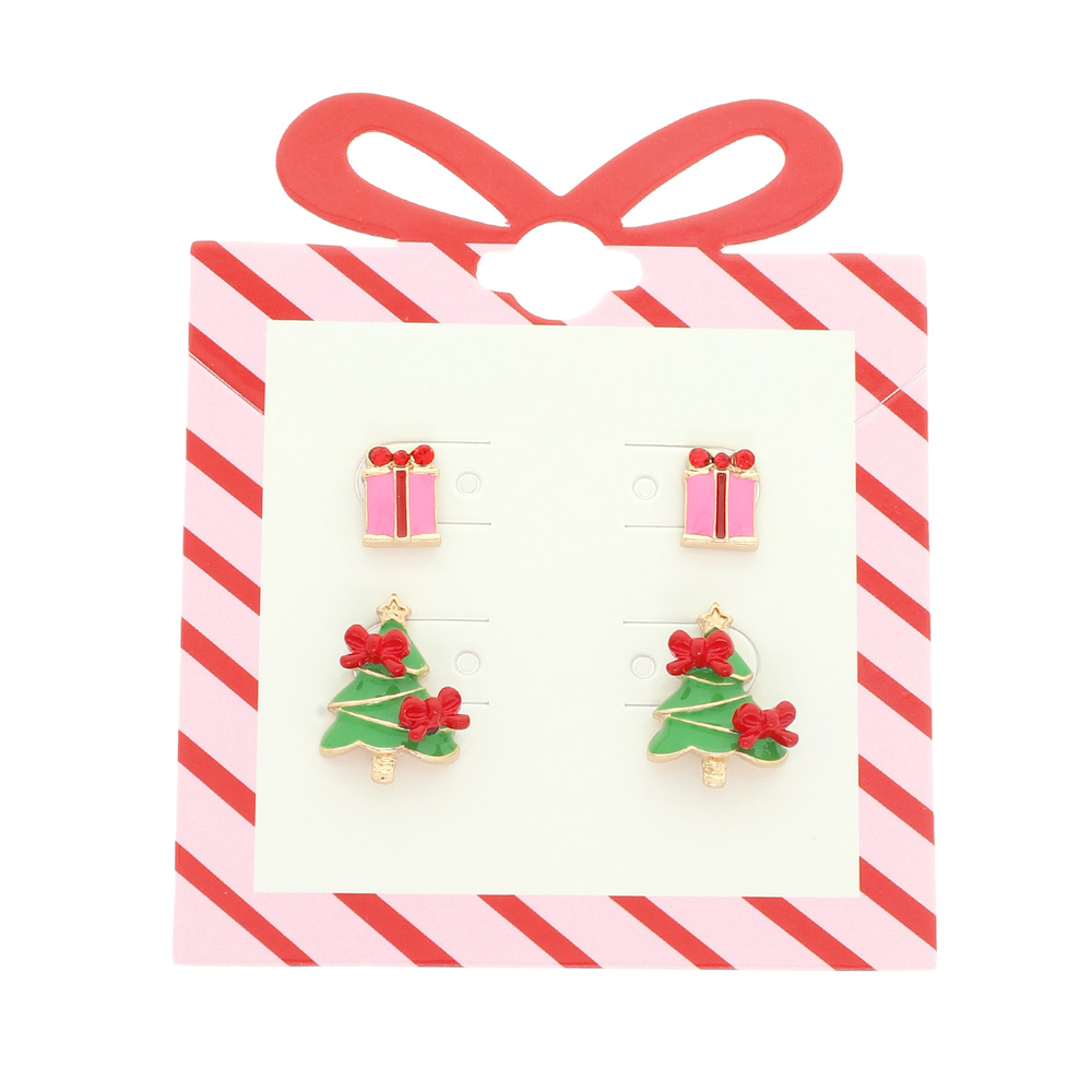 CHRISTMAS TWO PAIR TREE AND PRESENT ENAMEL EARRING SET WITH CRYSTAL ACCENTS
