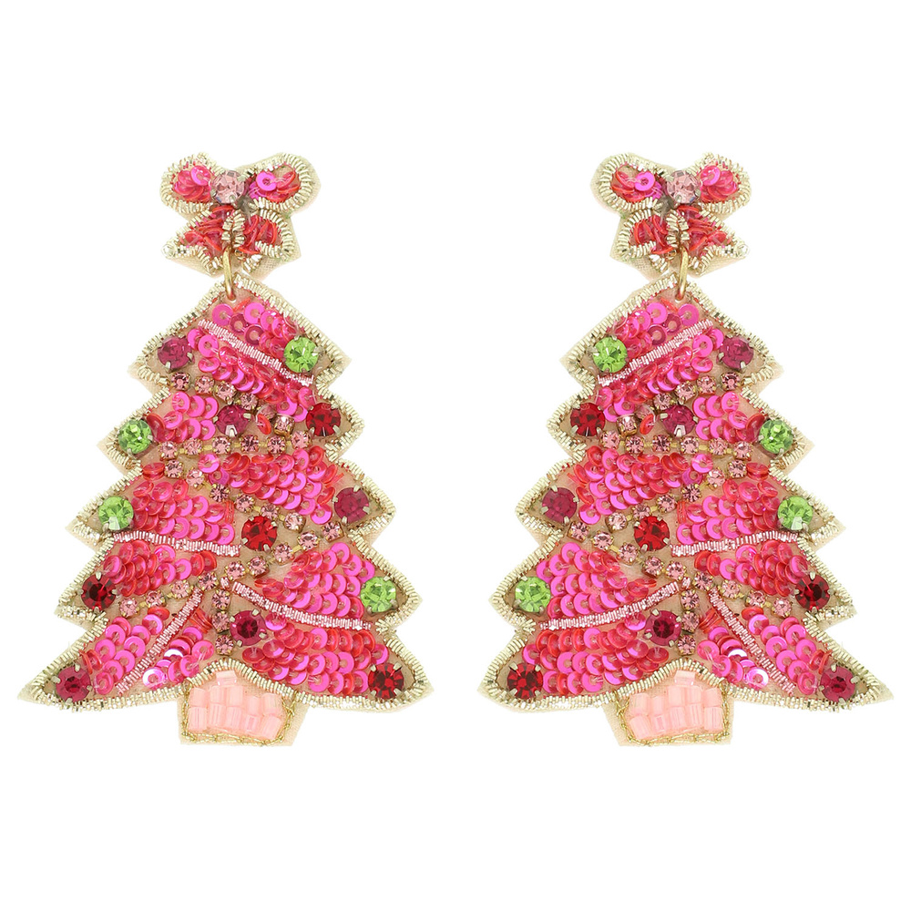 PINK CHRISTMAS TREE POST DANGLE EARRINGS WITH SEQUINS BEADED AND CRYSTAL ACCENTS