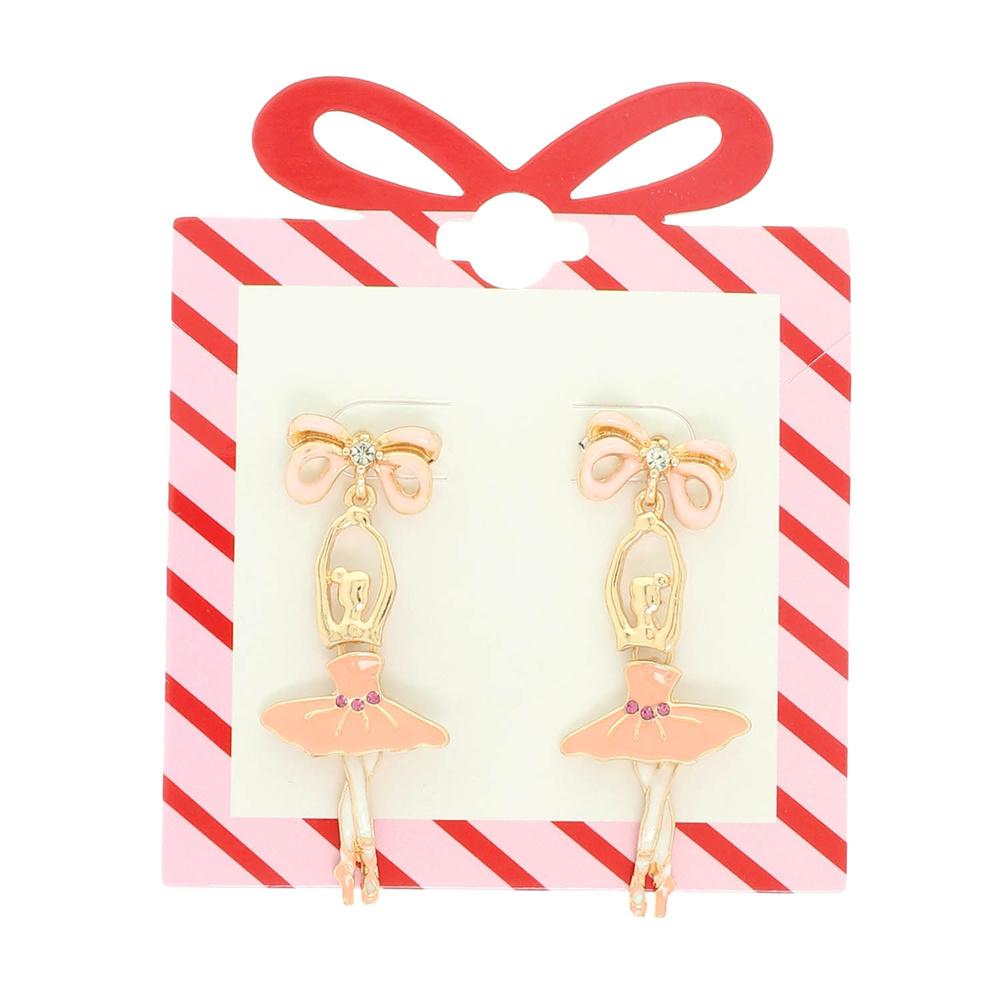 CHRISTMAS BALLERINA ENAMEL POST EARRINGS GOLD TONE TRIM BOW DETAIL AND CRYSTAL