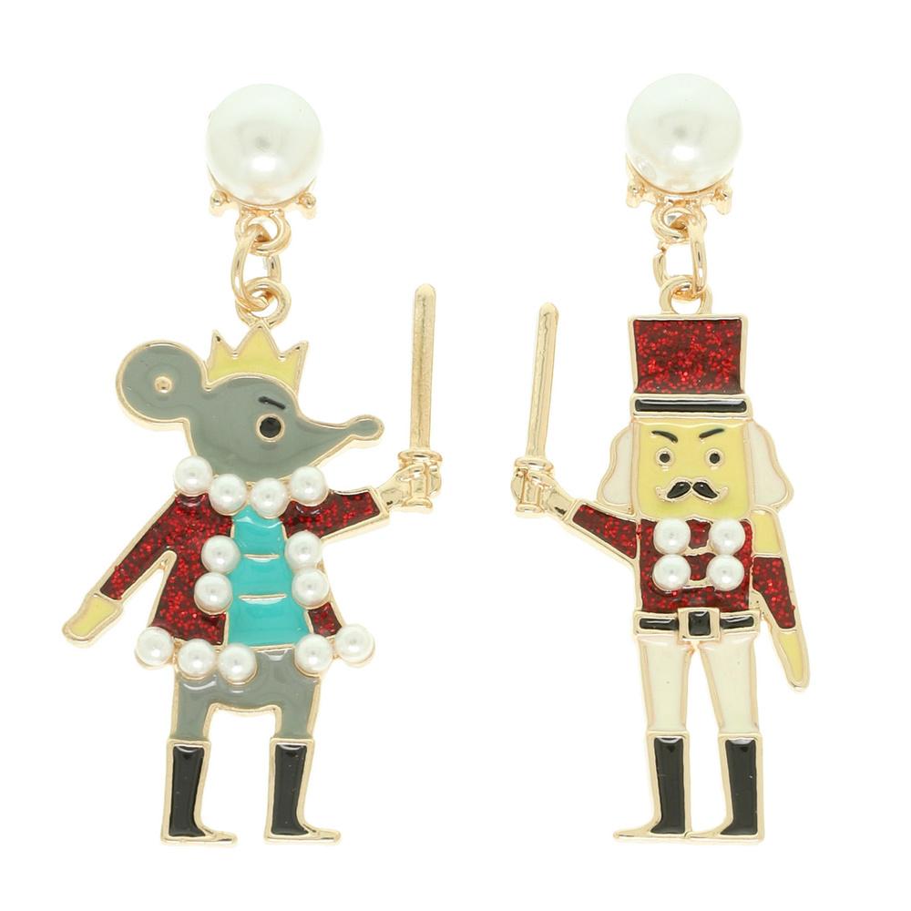 CHRISTMAS MOUSE AND NUTCRACKER ENAMEL POST DANGLE EARRINGS WITH PEARL ACCENTS