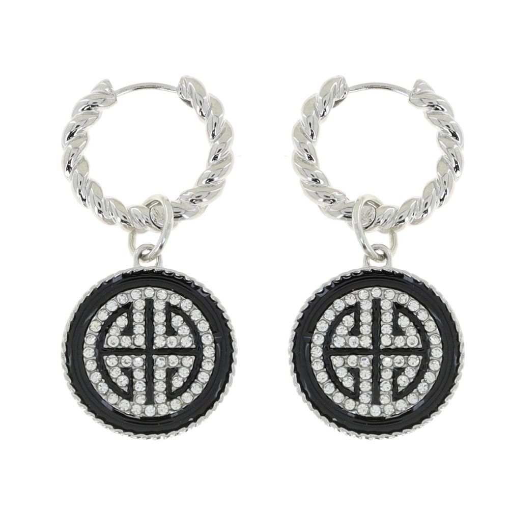 GREEK KEY SQUARE CRYSTAL RHINESTONE PAVE ENAMEL COATED CIRCULAR CHARM TWISTED HOOP EARRINGS